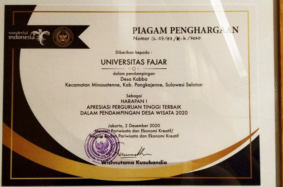 UNIVERSITAS Fajar (Unifa) kembali menorehkan prestasi. Desa Kabba, Kecamatan Minasatenne, Kabupaten Pangkajenne dan Kepulauan, yang menjadi desa dampingan Unifa meraih posisi 4 atau harapan 1 penilaian program Desa Wisata Terbaik (Deswita) 2020