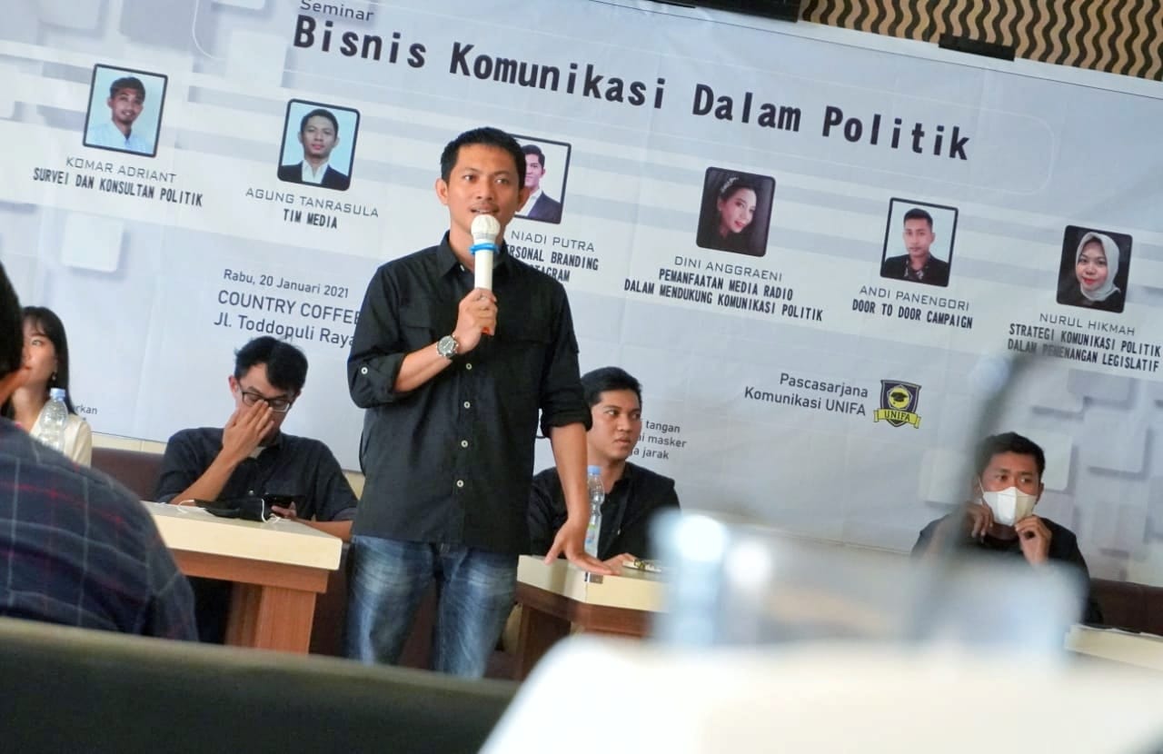 ENAM mahasiswa pascasarjana ilmu komunikasi Universitas Fajar (Unifa) menjadi pemateri seminar bertema "Bisnis Komunikasi dalam Politik" di Coffee Cafe Resto (CCR), Jl. Toddopuli, Makassar, Rabu (20/1/2021).