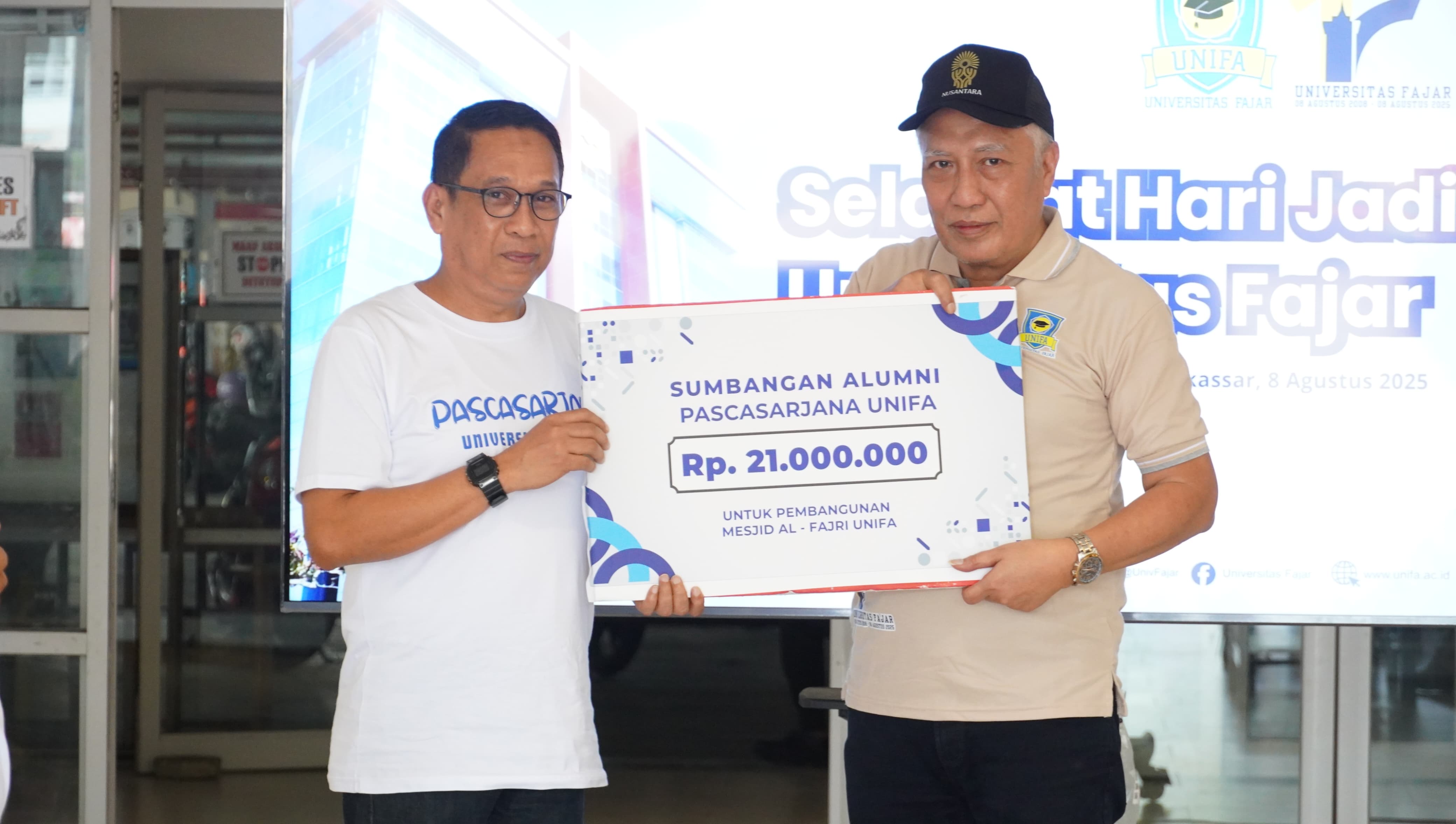 Sebagai bagian dari perayaan, dilakukan pula penyerahan bantuan dana sebesar Rp21.000.000 dari Ikatan Alumni Pascasarjana Universitas Fajar untuk pembangunan Masjid Al-Farji. Bantuan ini menjadi wujud nyata kepedulian alumni terhadap pengembangan fasilitas spiritual di lingkungan kampus.