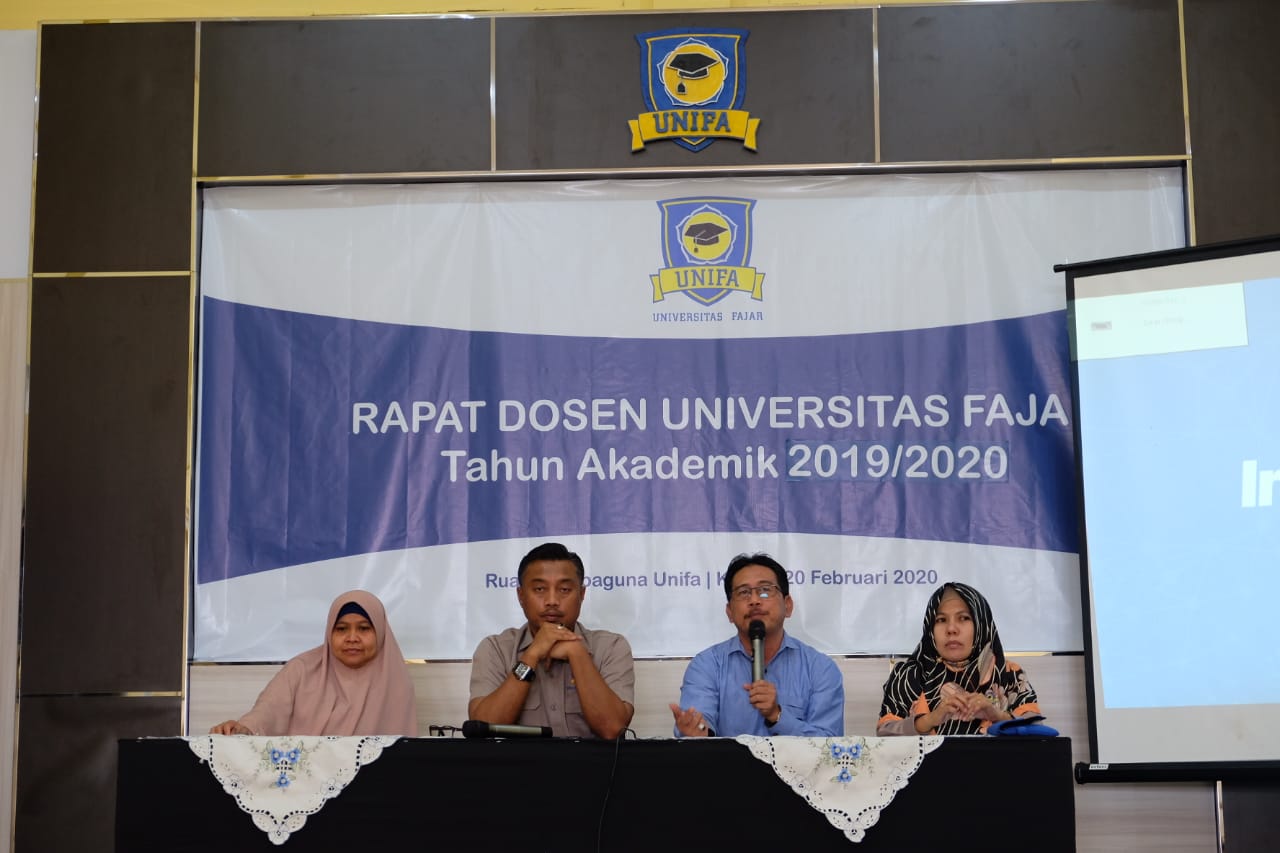 Sebagai langkah awal semester genap tahun akademik 2019/2020, pada hari Kamis, 20 Februari 2020 Universitas Fajar (Unifa) menggelar Rapat Dosen di Gedung Serbaguna Unifa. Rapat persiapan awal semester genap 2019/2020 dihadiri oleh Ketua Yayasan Pendidikan Fajar Ujungpandang, Rektor, Wakil Rektor 1, dan Wakil Rektor 2, serta Dekan FEIS dan Dekan Fakultas Teknik.