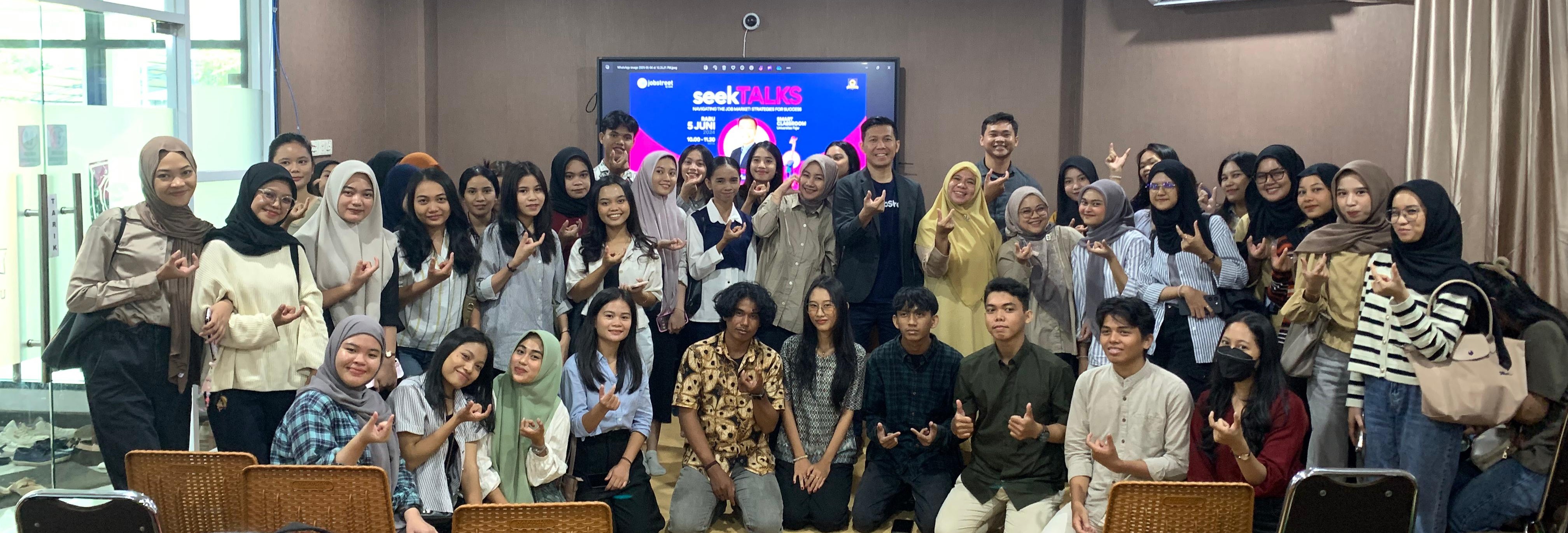 UNIVERSITAS FAJAR - UPT Pusat Karir Universitas Fajar bekerjasama dengan Jobstreet by Seek menggelar seekTalks bertema "Navigating the Job Market: Strategies for Success" yang diadakan di Smart Classroom Universitas Fajar pada Rabu, 5 Juni 2024. Acara ini dihadiri oleh Head of Partnership & Services Jobstreet by Seek Eka Kurniawan, Deputi Rektor I Universitas Fajar Ismail Marzuki, Kepala UPT Pusat Karir Unifa Zaryanti Zainuddin, S.T., M.T. serta mahasiswa Unifa dari jurusan komunikasi, teknik, akuntansi dan manajemen.